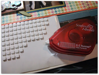 Once all of of the details were laid out I started adhering everything. For details on different types of adhesive and what to use when, check out the Tools section of this blog. Here I used 3D dimensional squares (which I just call pop dots) and double sided adhesive.